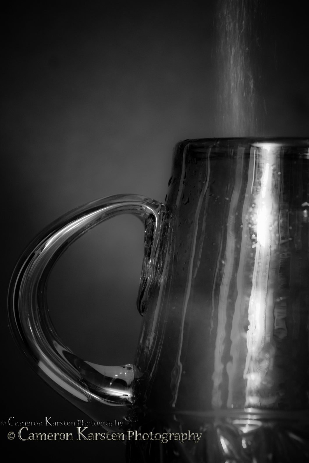 The next shot was more complex because I discovered that by slowing the shutter speed to capture the motion of the water into the container, and simultaneously popping the flash, I only captured the instant when to flashes fired. And when the flashes were off, and the shutter speed adjusted even longer, the clarity of the water never appeared in the final frame, only the jug against the black background. So, by changed liquids, substituting coconut milk for water, and turning off all lights once the jug was in focus in camera, I started pouring in the coconut milk before triggering the shutter speed for 2 secs and viola.
