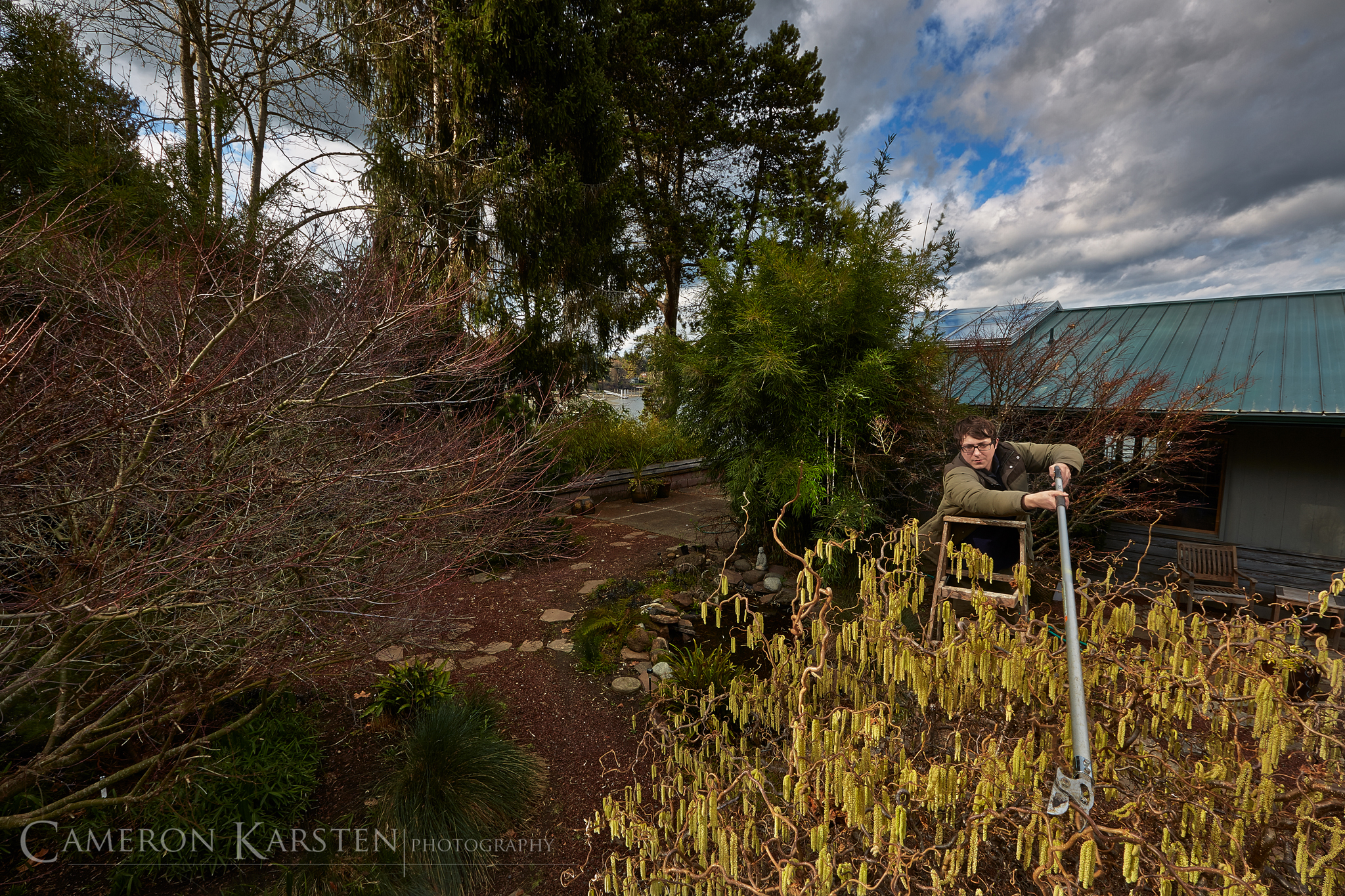 I invited Matt over on an unusually warm late winter day in the PNW. Two ideas: Matt in his element pruning trees outside (above); Matt taking the outdoor technique indoors and getting a little carried away (below).