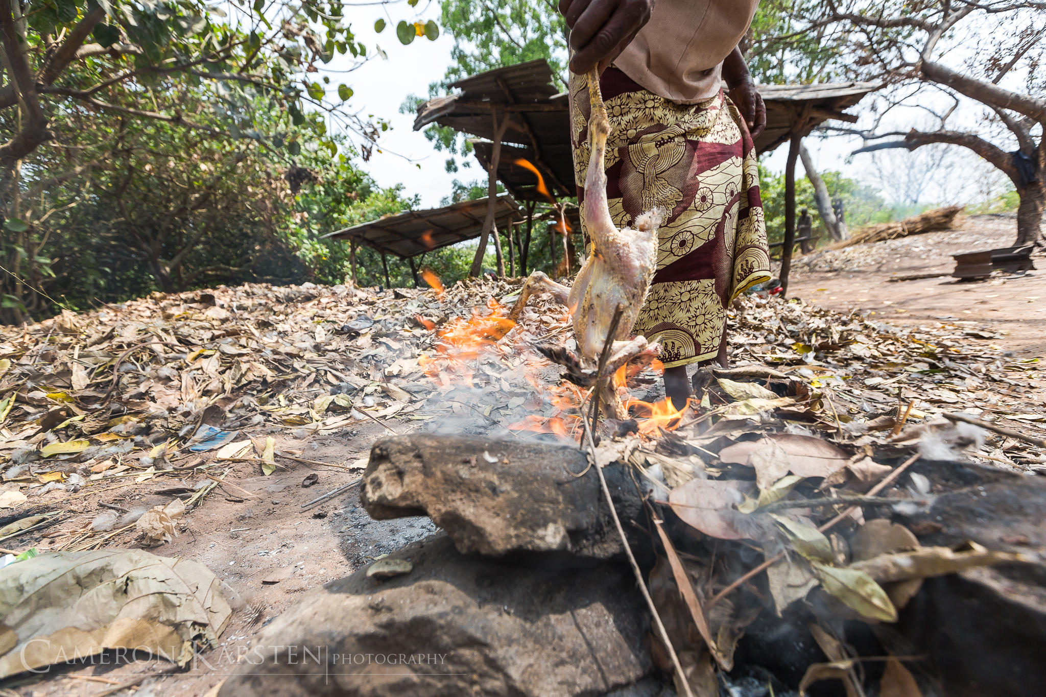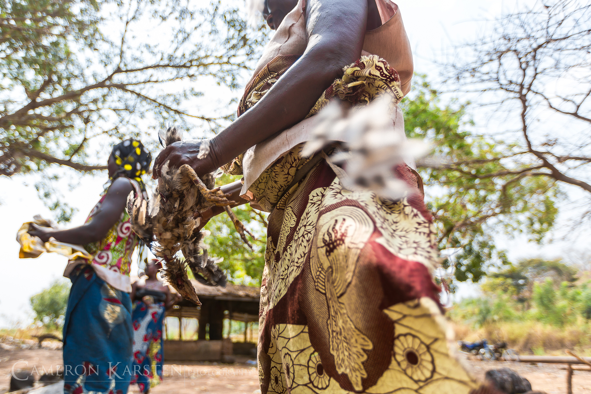 The bokounon is a big man with a chunky face and only few teeth. His voice is deep and loud. His Fon—the language of Benin—sounds drawn-out and melodic. On dramatic points of his story, he raises his arms in the air. “Wee!” he cries out as he talks about the beheading, running his hand along the edge of his neck. Ooooooh the scared children chirp. Another pause, and even though the tension in the audience is bursting, the narrator is hungry for corn porridge and chicken in spicy red sauce with beans. A feast. The children sit desirously glancing at the plates. They grab at everything Sagbadjou and his guests brush aside.